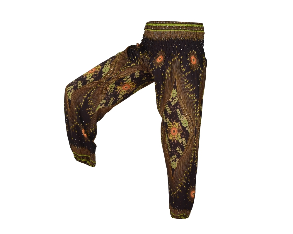 Kalhoty Joga WASTE, hnědé, zelené paví pera