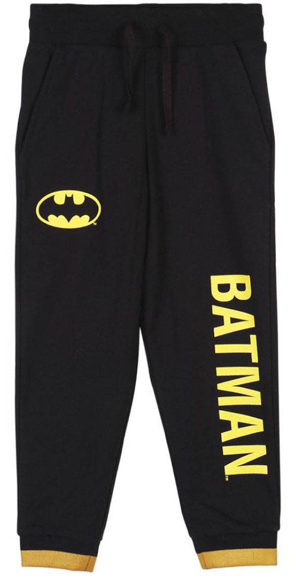 Černé dětské tepláky vyvedené s grafikou žlutého symbolu Batmana a žlutého nápisu: ,,Batman\'\'. Tepláky jsou vhodným doplňkem každého fanouška, který se odteď nebude stydět zachraňovat město i po domácku.