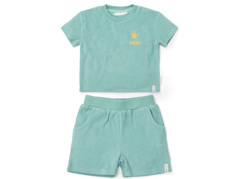 Tričko a kraťasy z příjemného bavlněného froté materiálu jsou ideální pro teplé letní dny na pláži, zahradě i na výletech a procházkách.Složení: 100% organická bavlnaMožno prát v pračce na 30°C. číst celé
