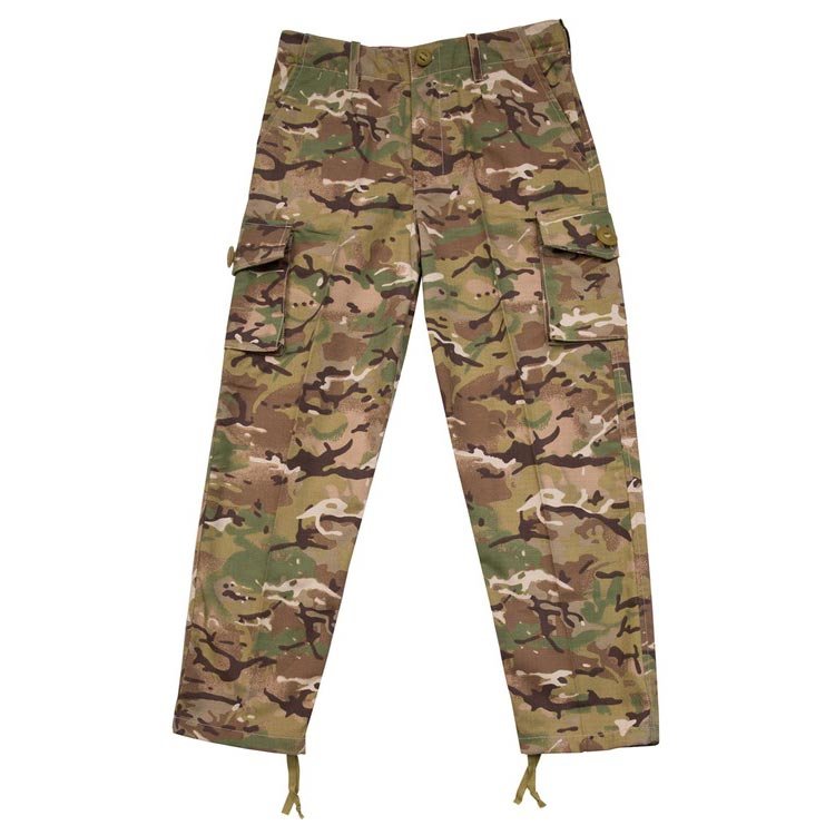 Dětské maskáče v maskování BTM (podobné jako MultiCam). Materiál: 65 % polyester, 35 % bavlna, rip-stop.