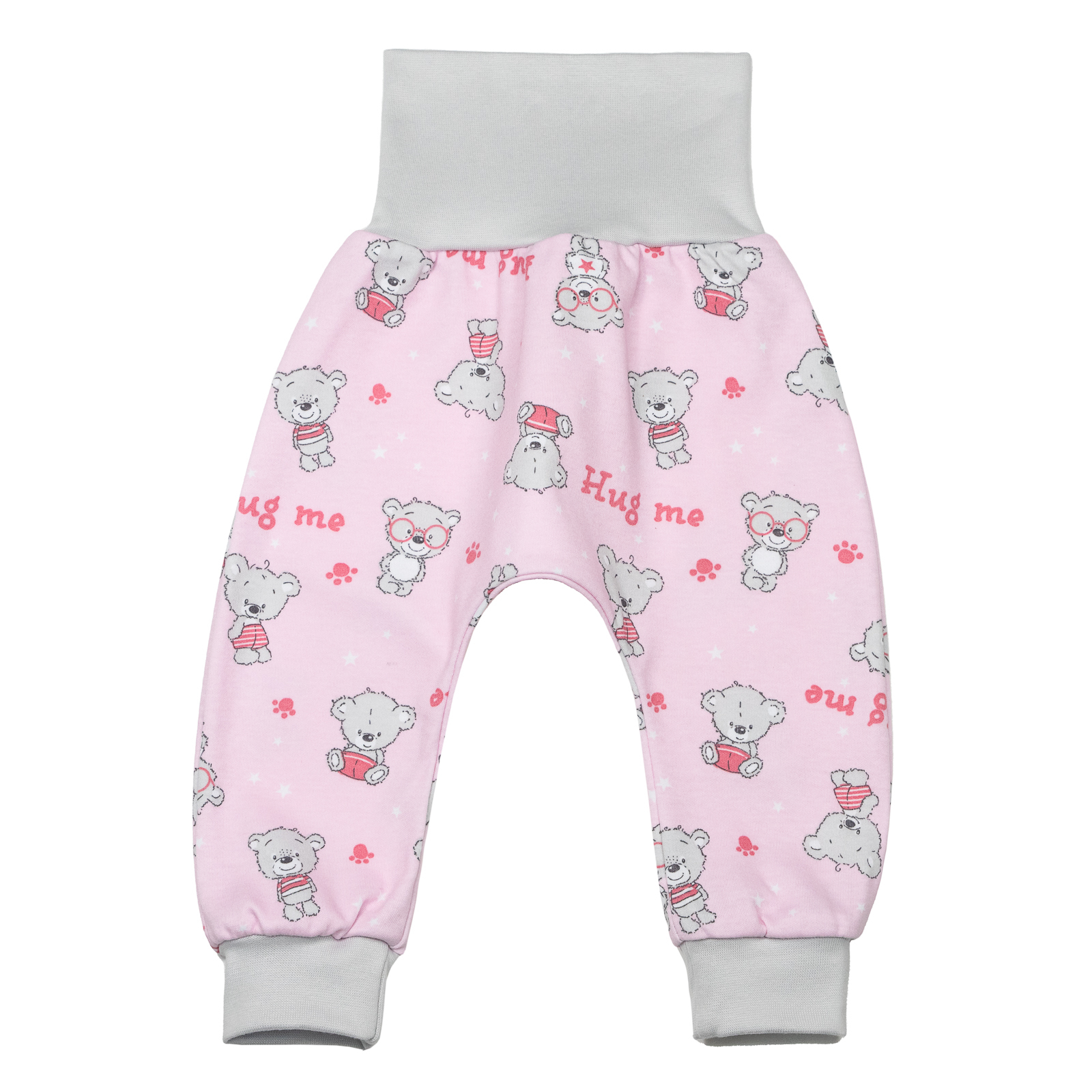 Dětské tepláky Teddy bears Pink pro kojence a miminka. Odpadá zapínání patentků jen stáhnout resp. přetáhnout a je hotovo. V pase je vysoký pružný patent, nehrozí tedy žádné otlačeniny, naopak zaručuje maximální pohodlí. Elegantní design - potisk bavlny s motivem medvídků. Díky kvalitnímu materiálu si tepláčky drží stále stejný tvar.