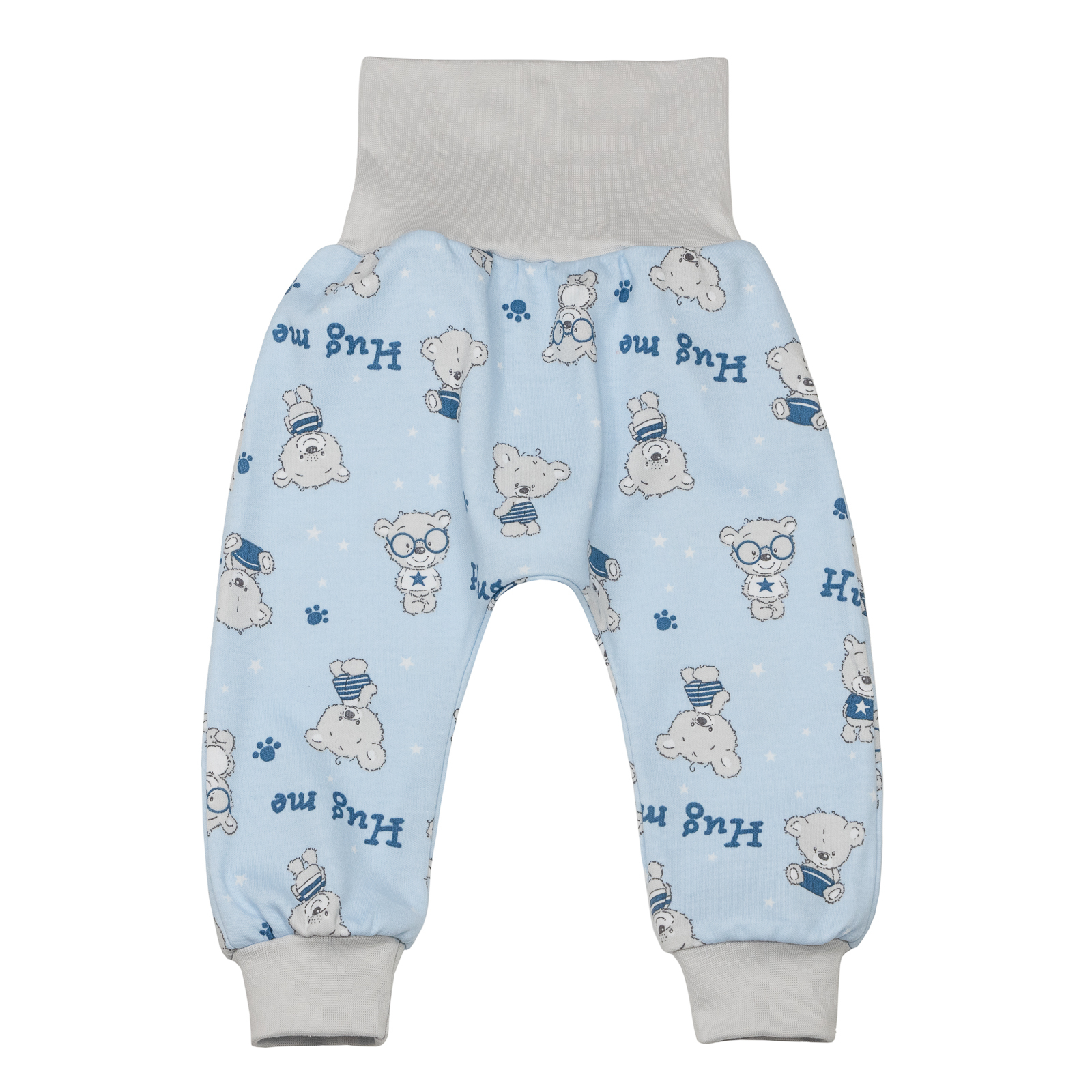 Dětské tepláky Teddy bears Blue pro kojence a miminka. Odpadá zapínání patentků jen stáhnout resp. přetáhnout a je hotovo. V pase je vysoký pružný patent, nehrozí tedy žádné otlačeniny, naopak zaručuje maximální pohodlí. Elegantní design - potisk bavlny s motivem medvídků. Díky kvalitnímu materiálu si tepláčky drží stále stejný tvar.