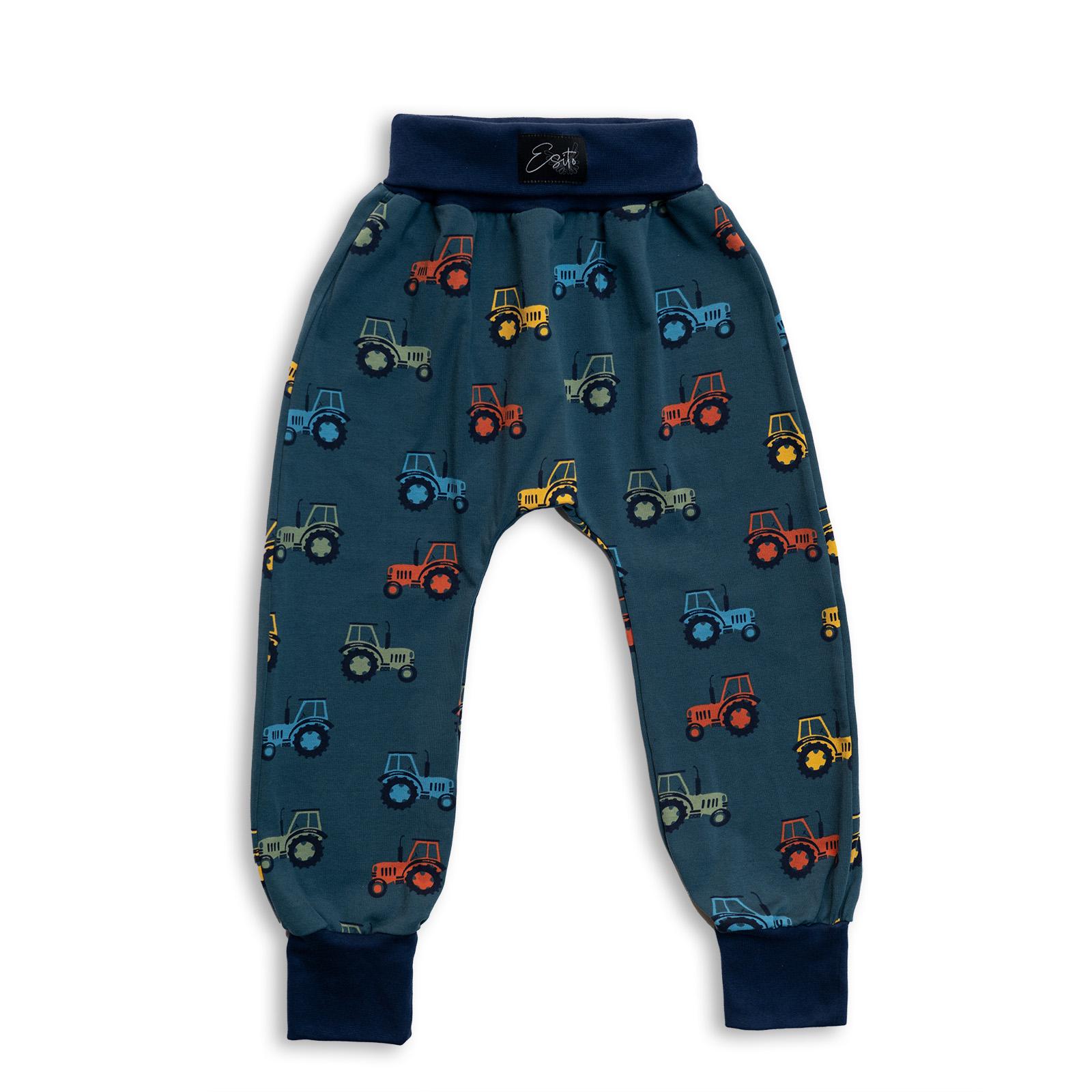 Rostoucí dětské tepláky Traktor jsou pružné dětské tepláky osvědčeného střihu s vysokým bavlněným nápletem v pase. Chlapecké tepláky parkour / baggy mají na spodní části unohavic vyšší náplet, který perfektně drží na obuvi nebo kolem nohy a hlavně prodlouží tepláky o jednu až dvě velikosti.