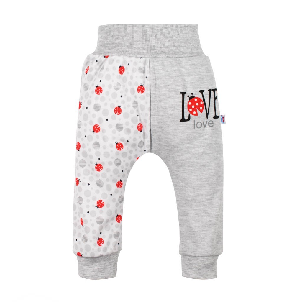 Bavlněné dívčí tepláčky české značky New Baby LadyBird pro miminka. Dětské tepláčky jsou potištěné beruškami a zdobené nápisem love. Mají široký stahovací pás. Složení: 100% bavlna.