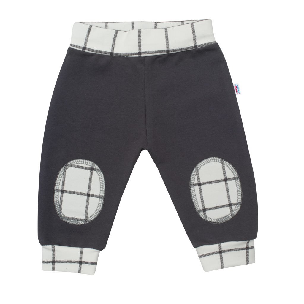 Tepláčky české značky New Baby Cool. Tepláčky mají v pase širší lem s gumičkou, na nohavičkách širší lem a na kolínkách šmrncovní záplaty. Lemy a záplaty jsou ušité z moderní kostkované látky. Složení: 95% bavlna, 5% elastan.
