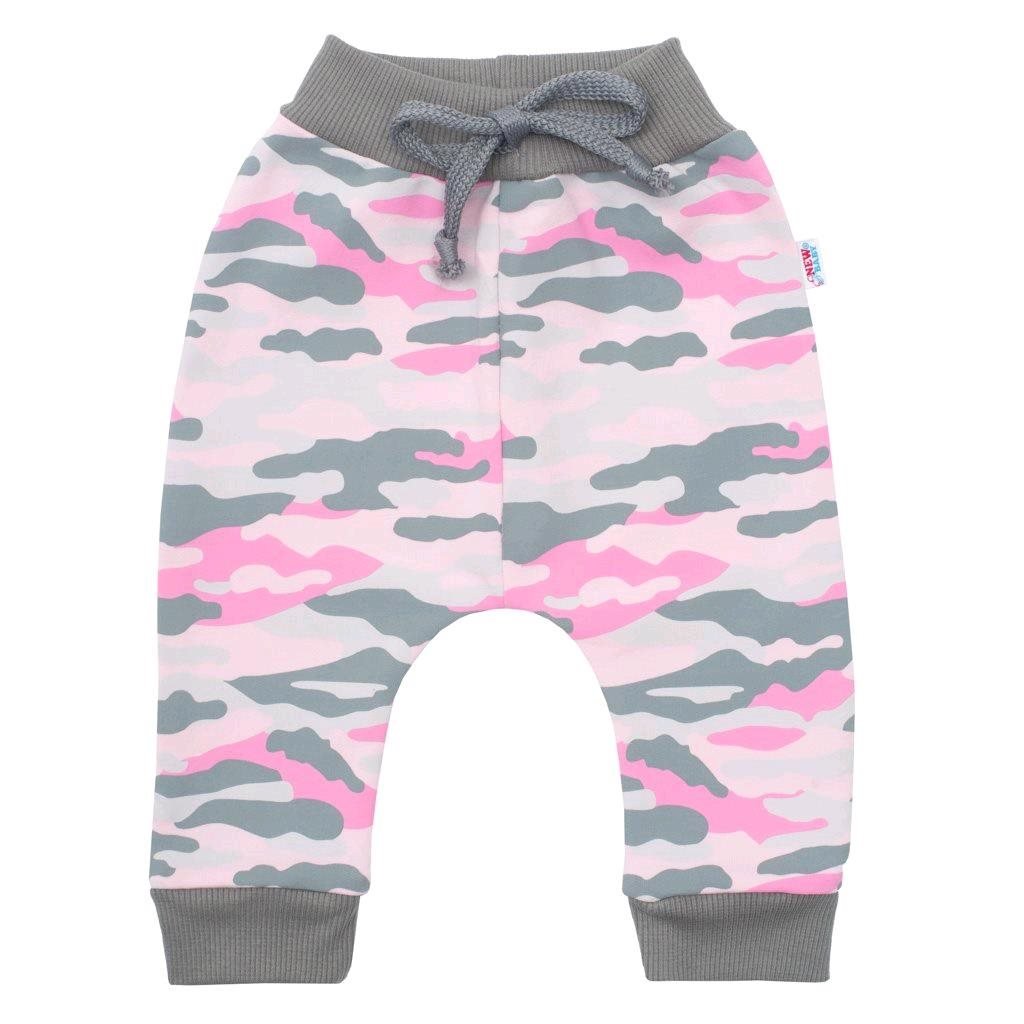 Stylové bavlěné tepláčky české značky New Baby With Love s maskáčovým potiskem mají v pase a na nohavičkách širší a pružný lem. Širší pružný pás na tepláčkách netlačí na bříško miminka. Moderní vzhled a správný šmrnc dodává tepláčkům snížený sed. Složení: 96% bavlna, 4% elastan.
