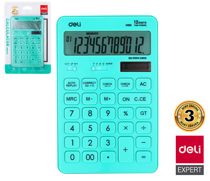- 12 místný display - velký displej- napájení solární / baterie- akrylový povrch - automatické vypnutí - procenta- 3 tlačítková paměť- automatické vyvolání- GT suma- snadný náhled- kontrola 120 kroků- oprava písmenem C- přepnutí funkcí - barva modrá- záruka 3 roky