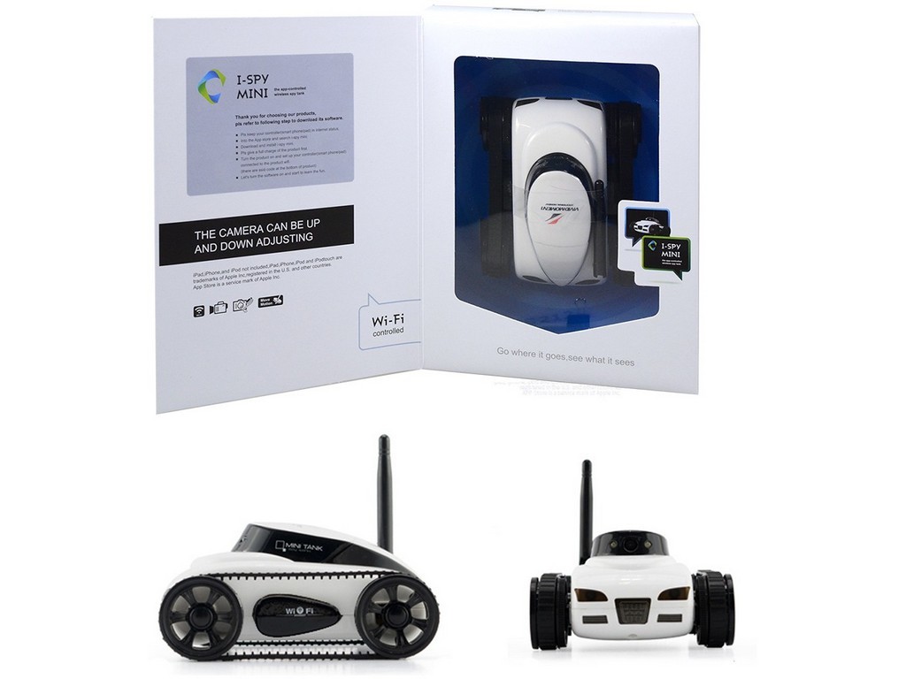 I Spy Mini je bezdrátově řízený "špionážní tank" s kamerou, ovládaný pomocí aplikace. Skvělé vozítko pro "tajného" agenta může při své cestě pořizovat videozáznam nebo jednotlivé fotografie. Nejdříve je nutné stáhnout si příslušnou aplikaci pro vaše "chytré" zařízení. Aplikce je dostupná pro systém iOS i Android. Po nainstalování je nutné připojit aplikaci i vozítko k WiFi síti a obě zařízení spárovat. Poté je možné I Spy Mini ovládat a pořizovat videozáznam nebo fotografie. Tyto nahrané soubory je možné přehrávat a prohlížet přímo v aplikaci. Vozítko jezdí vpřed, vzad, vlevo i vpravo. Je možné měnit vertikální úhel pohledu kamery (pozor, tato možnost je možná pouze mechanicky, nikoli prostřednictvím aplikace). Vozítko je vybaveno předními a zadními světly. Jestliže se vozítko nepohybuje přímo, k dispozici je korekce směru pomocí trimmování. Oblast, ve které lze tank bezpečně ovládat je kolem 15 m. Napájení pomocí přiložené nabíjecí baterie 5 V. Baterie se nabíjí přes USB konektor. Nabíjení trvá okolo 120 minut a doba provozu po plném nabití baterie je cca 20 min. Součástí balení je I Spy Mini, USB nabíjecí kabel a návod. Rozměr vozítka je 5,8 x 12 x 9,70 cm, rozměr boxu 22 x 17 x 8 cm.