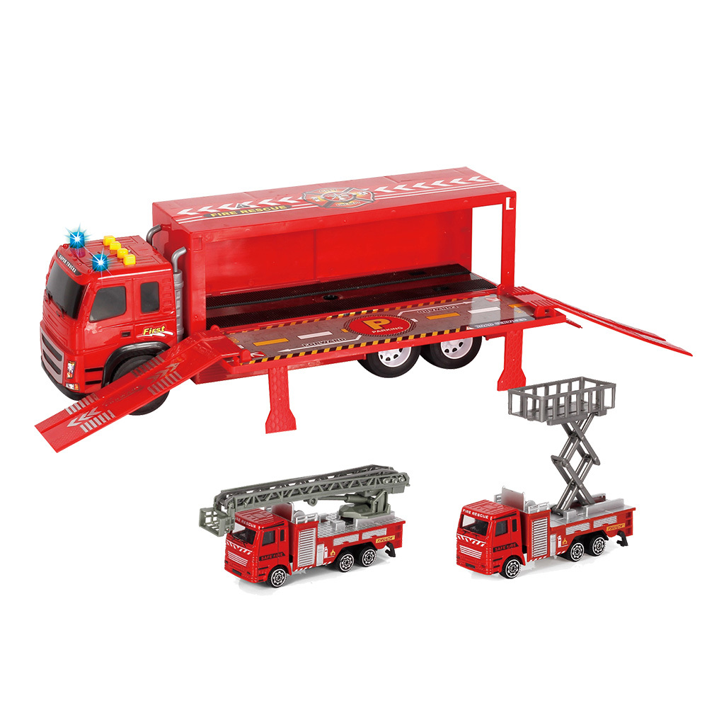 Krásná sada tří hasičských aut potěší každého malého hasiče! Hasičský kamion o délce 39 cm je určeno pro děti od 3 let. Auto je vyrobeno z PVC a jezdí na setrvačník. Na kabině má čtyři tlačítka. Po zmáčknutí kteréhokoliv tlačítka začne auto vydávat reálné zvuky a blikat. Kamionu lze otevřít bok korby a rovněž je opatřen najížděcí plošinou v zadní části auta. Zde mohou vjíždět do kamionu dvě menší hasičská auta, která jsou opatřena žebříkem a výsuvnou plošinou. Baleno v krabici. Tři baterie typu LR44 jsou so