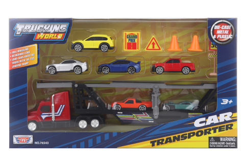 Plastový kamion pro převoz autíček. Balení obsahuje také 6 kovových autíček a 5 plastových dopravních značek. Rozměry kamionu cca 32 x 7 cm. Rozměry balení cca 35,5 x 20,5 x 6 cm. Věk 3+