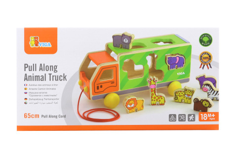 Dřěvěná tahačka a vkládačka kamion se zvířátky. Balení obsahuje 8 zvířátek na vkládání. Rozměry kamionu cca 27 x 12,5 x 12 cm. Rozměry balení cca 28 x 13 x 15 cm. Věk 18m+
