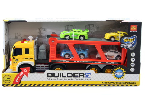 Kamion na baterie (jsou součástí balení). Po stisknutí tlačítek kamion vydává zvuky a svítí. Měřítko 1:16. Obsahuje také 4 plastová autíčka. Rozměry kamionu cca 40 x 12 cm. Věk 3+ číst celé