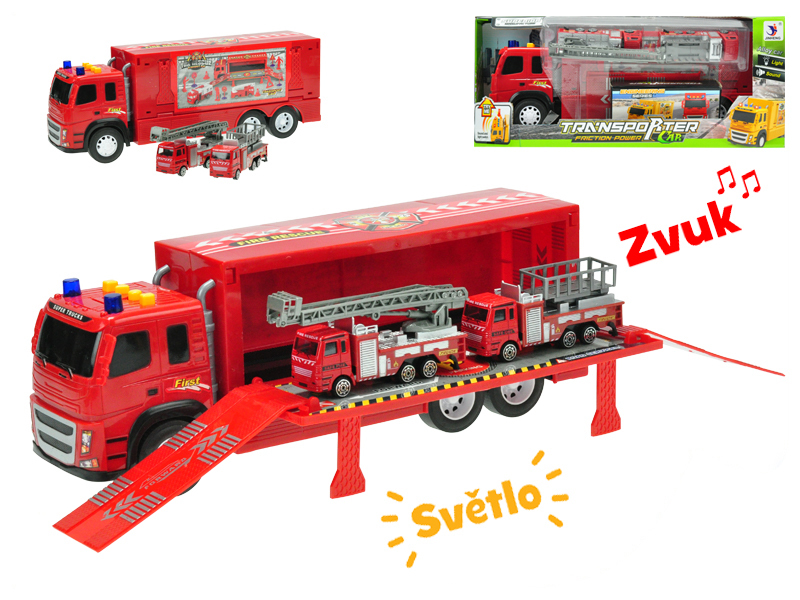 Kamion 40cm na setrvačník na baterie se světlem a zvukem+2auta hasiči kov 12cm v krabičce