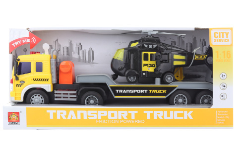 Kamion s helikoptérou na baterie. Po stisknutí tlačítek kamion vydává zvuky a svítí. Rozměry kamionu cca 40 x 11 x 8 cm. Rozměry balení cca 42 x 18 x 12 cm. Napájení na 3 AG13 (jsou součástí balení). Věk 3+ číst celé