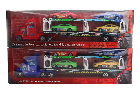 Velký kamion s návěsem a 4 autíčky. Materiál plast. Rozměry kamionu cca 53 cm x 11 cm. Vzadu má kamion sklopný nájezd. Rozměry balení cca 60 x 17 x 10 cm. Věk 0+ číst celé