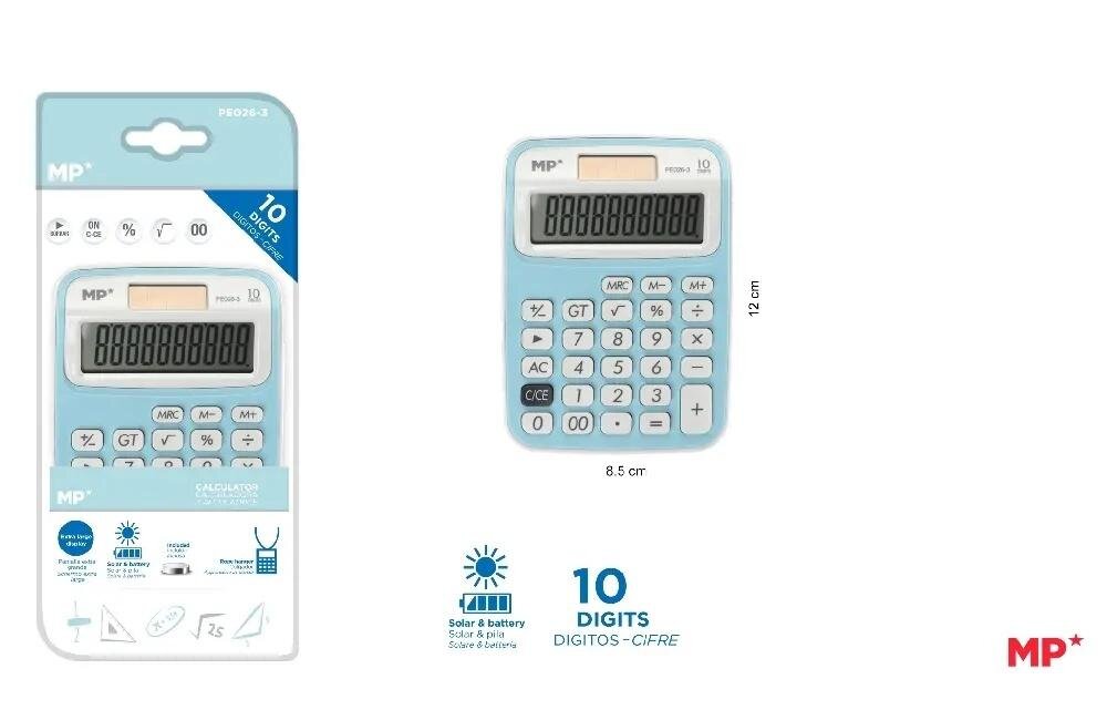 10-cyfrowy kalkulator biurkowy. Działa na energięsłoneczną lub baterie. Bardzo duży ekran. Kluczsumy całkowitej. Klucze pamięci: MRC, M-, M+.Klawisz do usunięcia ostatniej wprowadzonej cyfry.Klucz % i podwójne 0. Wymiary: 120 x 85 mm.Jasny niebieski. Blister 1 sztuki. číst celé
