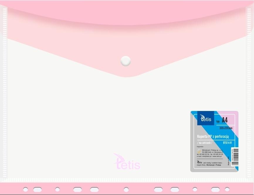 Koperta PP na zatrzask z europerforacją, mieszcząca format A4. Wymiary:308x235 mm, grubość: 0,2 mm. Opakowanie: folia 6 sztuk.
