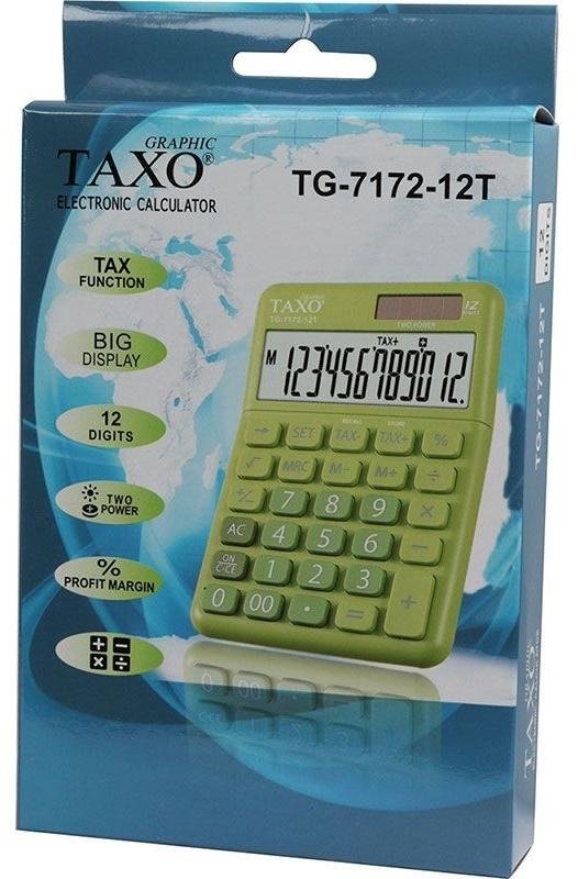 12-pozycyjny, duży wyświetlacz, plastikowe klawisze i obudowa, dostępna w 4 modnych kolorach, podwójny system zasilania: bateria lub energia słoneczna, obliczenia z wykorzystaniem pamięci (M+/M-, MRC), pierwiastek kwadratowy, obliczenia procentowe, przycisk ustawiania podatku (SET), obliczanie podatku (TAX-/TAX+), klawisz zmiany znaku (+/-), klawisz podwójnego zera, klawisz cofania, wymiary: 120 x 148 x 29 mm