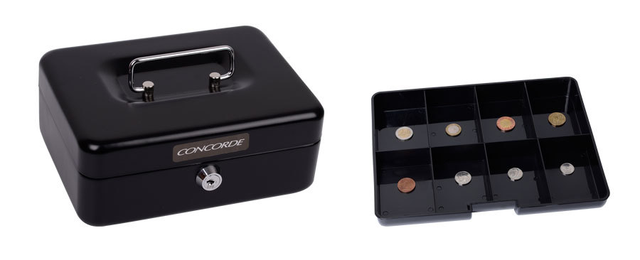 Kovová pokladna vyrobená z bezešvého ocelového plechu , přihrádka na mince, uzamykatelná, přenosná. 195 x 145 x 75mm. číst celé
