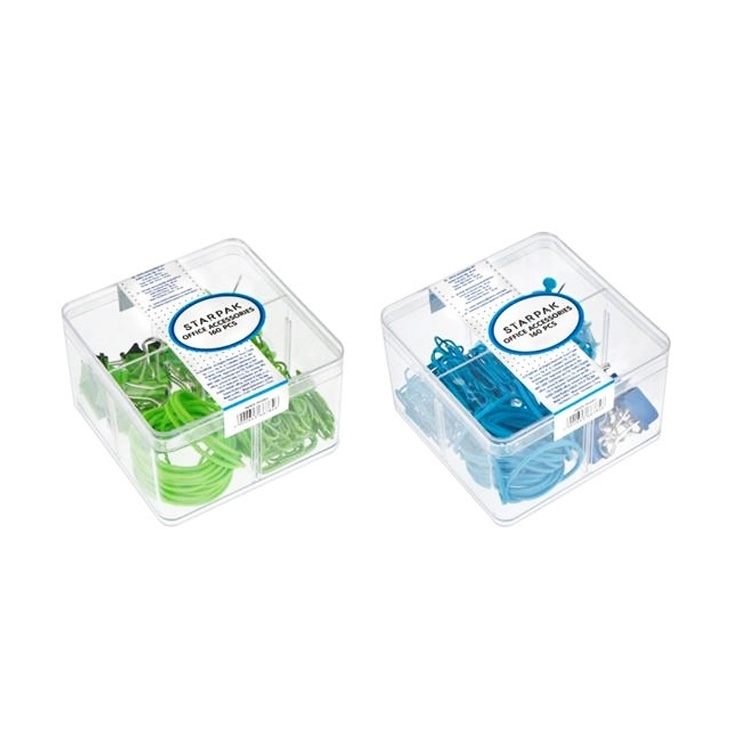 Sada kancelářského příslušenství sestávající ze 160 prvků. Sada obsahuje kancelářské sponky, kancelářské sponky a špendlíky na korkovou desku. Kancelářské doplňky v modré nebo zelené barvě v plastové krabičce. Výrobek je určen pro děti ve věku od 3 let. Rozměry balení (V x Š x H) [cm] 6x9,5x9,5.