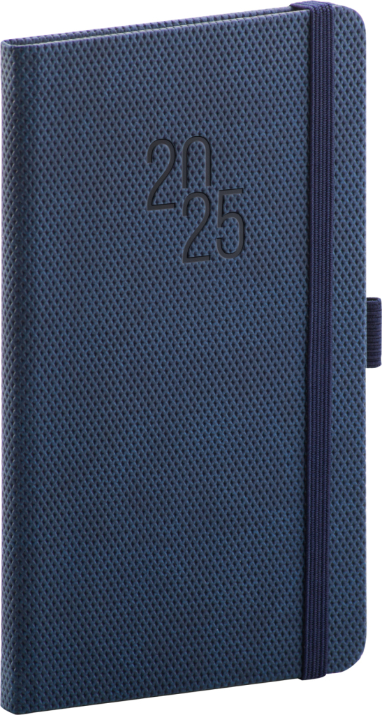 Kapesní diář Diamante 2025 v modré barvě. I zde je možnost ražby letopočtu a loga. Týdenní rozvrh s česko-slovenským kalendáriem a doplňkovou angličtinou, němčinou, maďarštinou a ruštinou.