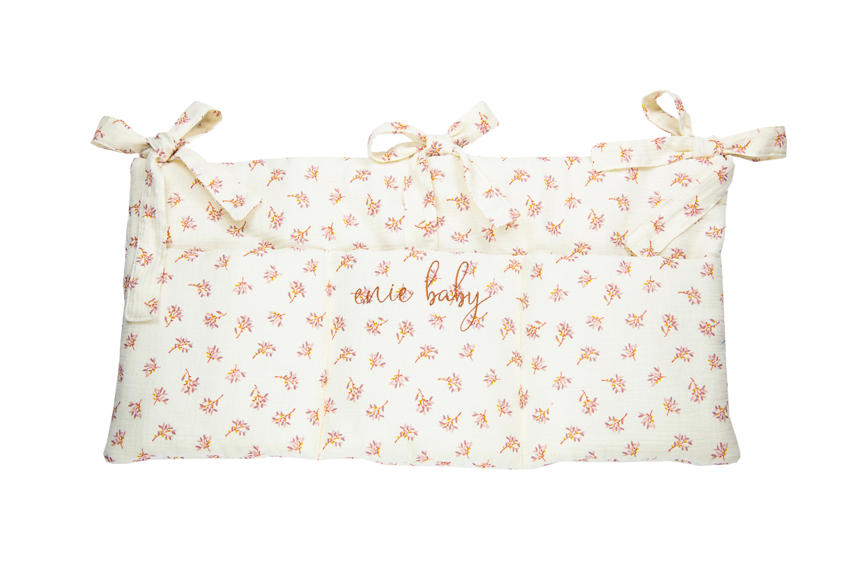 Kapsář na postýlku z mušelínu má tři prostorné úložné kapsy na ukládání hraček, deček, dudlíků a dalších nezbytností, jako jsou plenky nebo vlhčené ubrousky. Kapacita kapsy je 4- 8 plenek. Místo na vše, co chcete mít po ruce. Pomocí tří horních mašlí ho snadno zavěsíte kamkoliv. Celkové rozměry 60x30 cm.