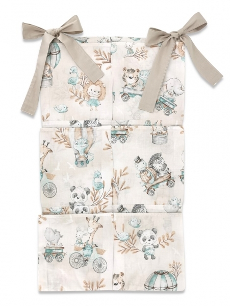 Kapsář na postýlku 6 kapes, bavlna, ZOO na cestách - cappuccino/mátová
