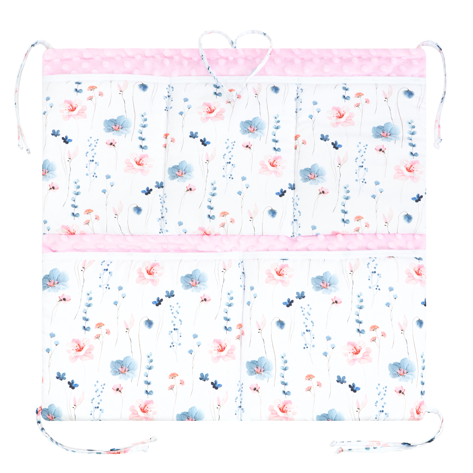 Dětský kapsář na postýlku je praktický doplněk do dětského pokojíčku z ucelené kolekce Verona. Velikostí je kapsář vhodný jak na dětskou postýlku, tak na přebalovací pult nebo jde zavěsit na stěnu. Zcela jistě využijete 5 praktických kapes pro uložení spousty drobností. Kapsář na postýlku je polstrován tenkým, ale tuhým dutým rounem, aby krásně držel tvar. Polstrování kapsáře zároveň tvoří ochranu hlavičky při případném pádu miminka na postýlku v době, kdy se učí sedět nebo chodit. Zavěšení na zavazovací šňůrky, 3x nahoře a 2x dole.