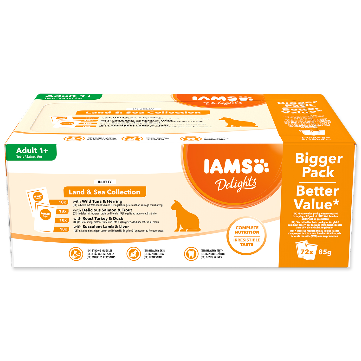 Pevninská a mořská kolekce IAMS Delights v rosolu je 100% kompletní a vyvážené prvotřídní mokré krmivo pro dospělé kočky v praktickém balení multipack. Pevninská a mořská kolekce v rosolu obsahuje čtyři lahodné receptury, které si vaše kočka zamiluje: divoký tuňák se sleděm, lahodný losos a pstruh, pečené krůtí a kachní a šťavnaté jehněčí s játry. Každá receptura je připravena s láskou z kvalitních ingrediencí, které zaručí neodolatelnou chuť. Kočka získá z krmiva živiny, díky kterým bude zdravá a silná a bude skvěle vypadat i se tak cítit. IAMS Delights poskytuje klíčové nutriční výhody pro každou životní fázi zvířete. Krmivo pro dospělé kočky obsahuje kvalitní živočišné bílkoviny pro zachování silných svalů. Biotin, minerály a vitamíny udržují zdravou kůži a srst. Tato receptura obsahuje minerály pro zachování silných zubů a kostí. Krmivo IAMS Delights poskytuje kočkám odborníky vytvořenou výživu, kterou potřebují, spolu s chutí, kterou si bezpodmínečně zamilují.