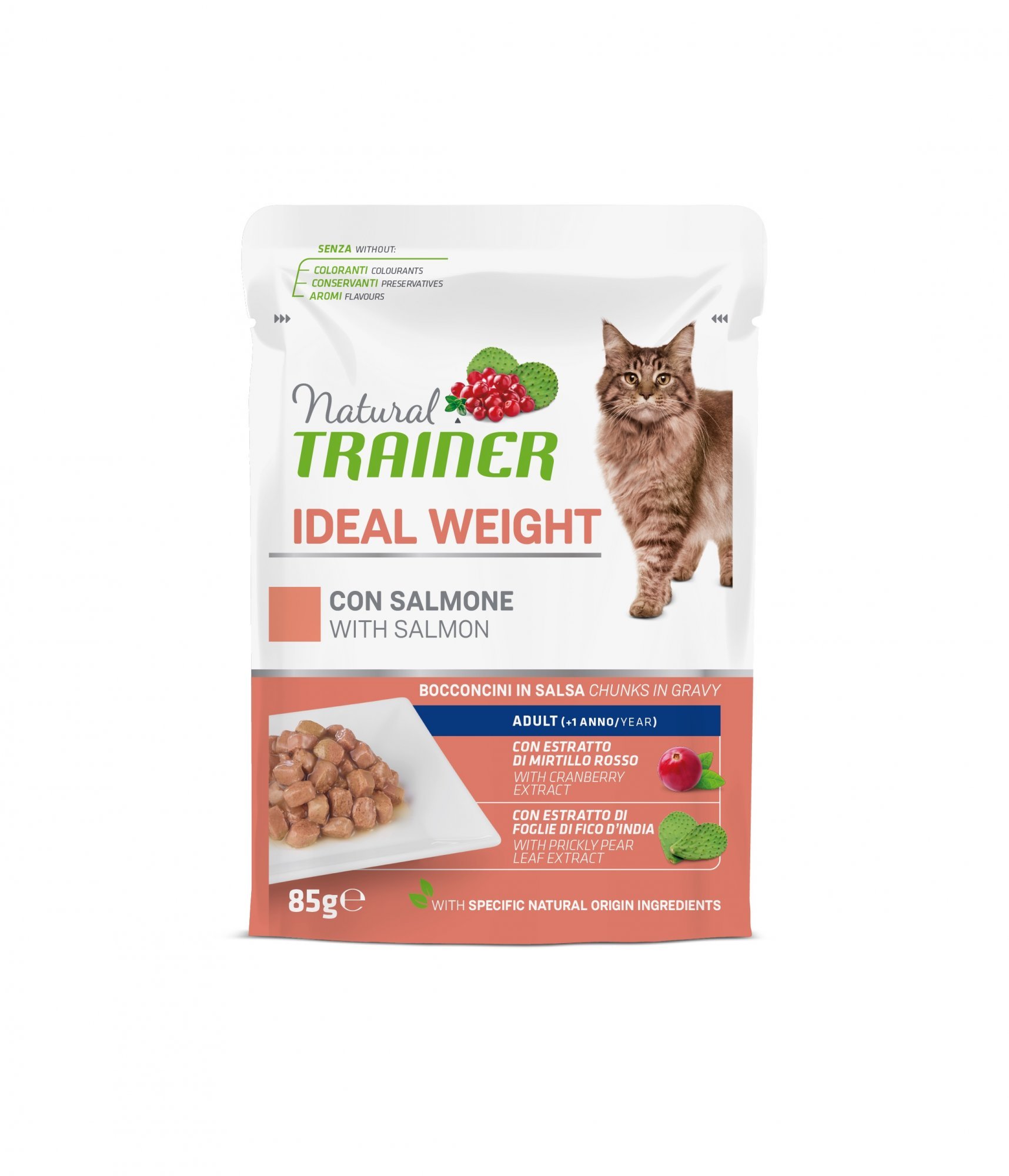 Kapsička Trainer Natural CAT SP. IDEAL WEIGHT losos je speciálně vyvinutá pro kočky, které potřebují udržet nebo dosáhnout ideální tělesné hmotnosti. Díky kvalitní kombinaci drůbeže, vepřového masa a lososa nabízí vašemu mazlíčkovi chutný a zároveň výživný pokrm.