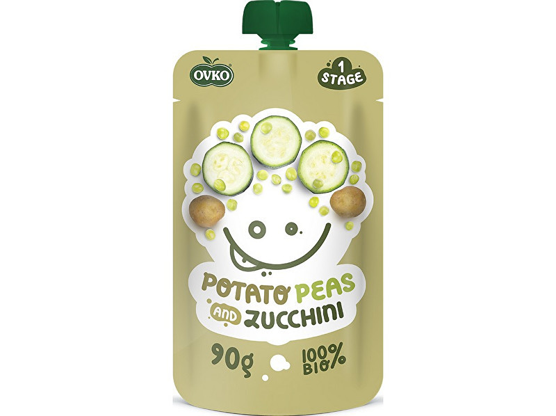 Složení: zelenina 69 % (brambory 31,5 %, hrášek 22,5 %, cuketa 15 %), voda. Složky označené pocházejí z kontrolovaného ekologického zemědělství.Obsah: 90gZemě původu: Slovensko
