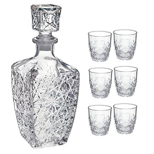 Tato vintage sada Dedalo obsahuje šest skleniček a karafu, která je zdobená velkolepými řezbami, které umocňující jantarovou barvu whisky. Skleničky s klasickým tvarem jsou zdobeny třpytivým hvězdicovým vzorem stejně jako karafa. Design je inspirovaný ledovou tříští.Sada je ideálním dárkem.Balení obsahuje: 6 ks x 26 cl, 1 x 78 clBarva: čiré sklo