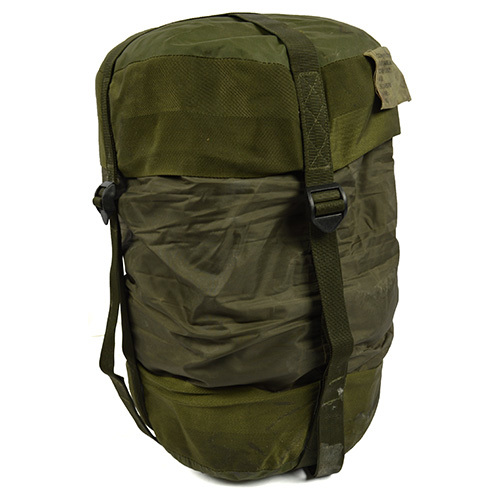 Náhradní obal pro spací pytle. Originální armádní lehce použitý. Kompresní popruhy. Rozměr cca 20 cm (průměr dna) x 33 cm.