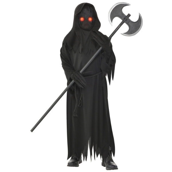 Proměňte své dítě v opravdového posla temnot s tímto dětským kostýmem smrťáka. Kostým zahrnuje dlouhou černou róbu s roztřepeným spodním lemem, pásek na převázání, masku se zářícíma LED očima a rukavice, které dotvoří celý děsivý vzhled. Díky svítícím efektům působí převlek ještě strašidelněji a je ideální na Halloween, maškarní plesy i tematické dětské party.Kostým je vyroben z lehkého a pohodlného materiálu, aby se v něm dítě cítilo dobře i při delším nošení.