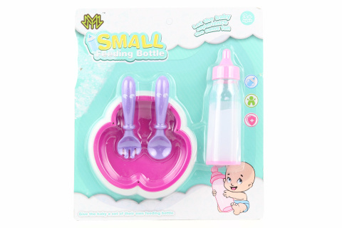 Plastová dětská lahvička o velikosti 12 cm a talířek s příborem o velikosti cca 11 cm. Rozměr balení cca 22 x 19,5 x 2,5 cm. Věk 3+ číst celé