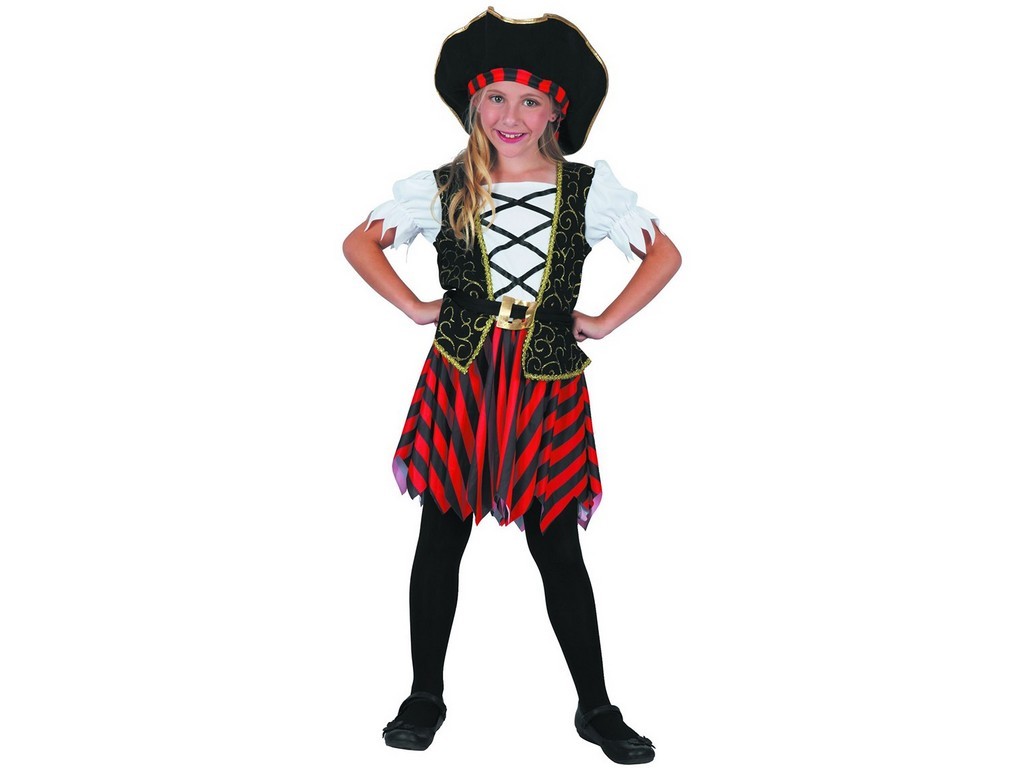 Šaty na karneval - pirátka, 120-130 cmVelikost: 120 - 130 cm.Kostým je vhodný pro holky ve věku 5-9 let.Balení obsahuje:- šaty- klobouk- opasek číst celé