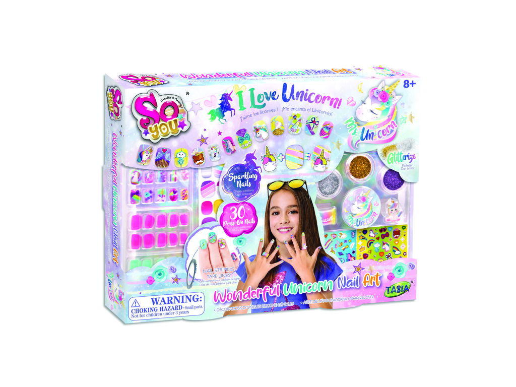 - Obsahuje sadu nalepovacích nehtů s motivem jednorožce.