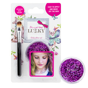 Třpytivý tělový gel Lukky s aplikátorem. Snadno se nanáší a je lehce omyvatelný. Vhodný pro děti od 3 let. číst celé