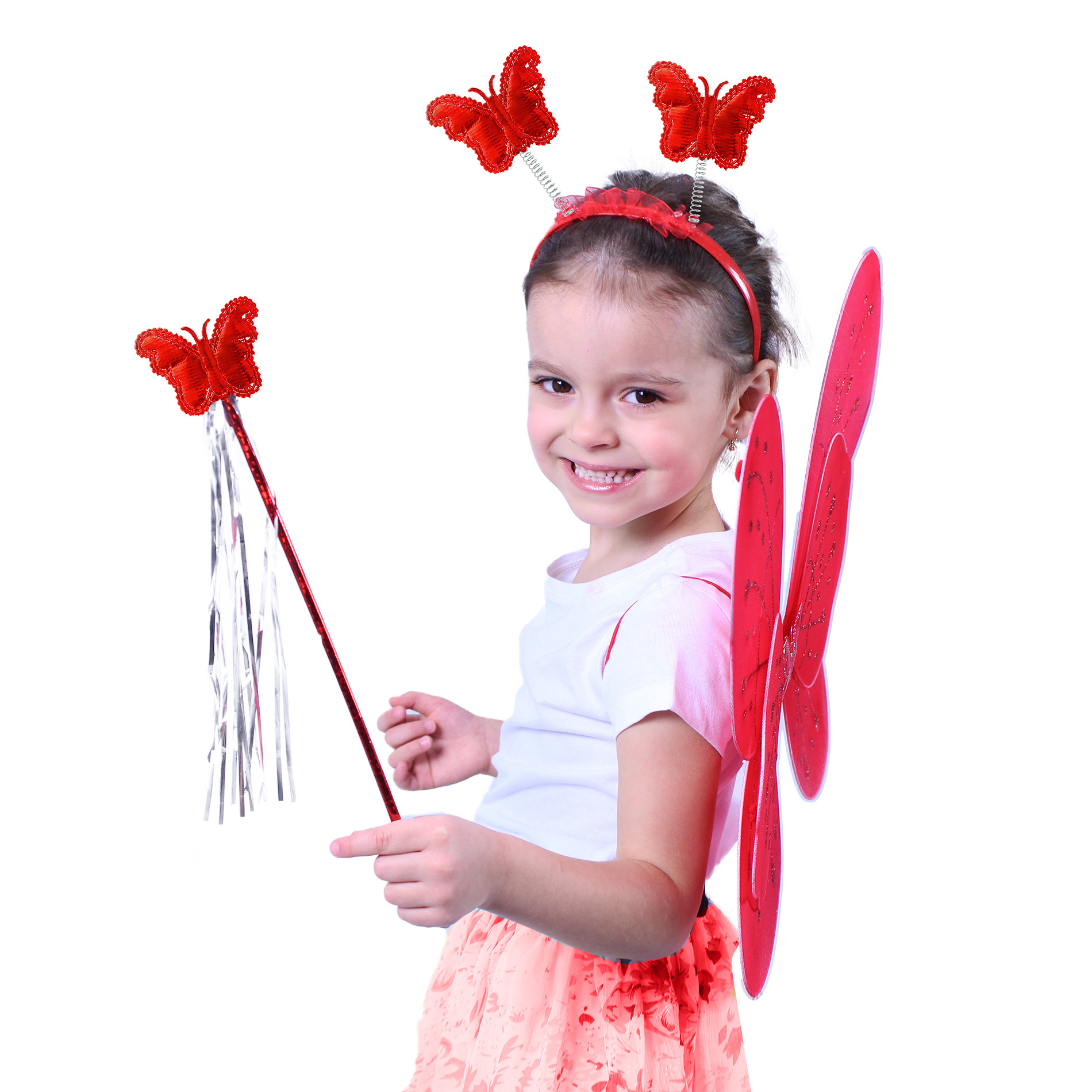 Motýlí křídla v zářivě červené barvě jsou ideální doplněk pro malé princezny, které chtějí zažít kouzlo pohádek a karnevalů. Tato sada navíc obsahuje jemnou čelenku s motýlky na pružinkách a šarmantní hůlku, která doplní celý kostým a podnítí dětskou představivost.