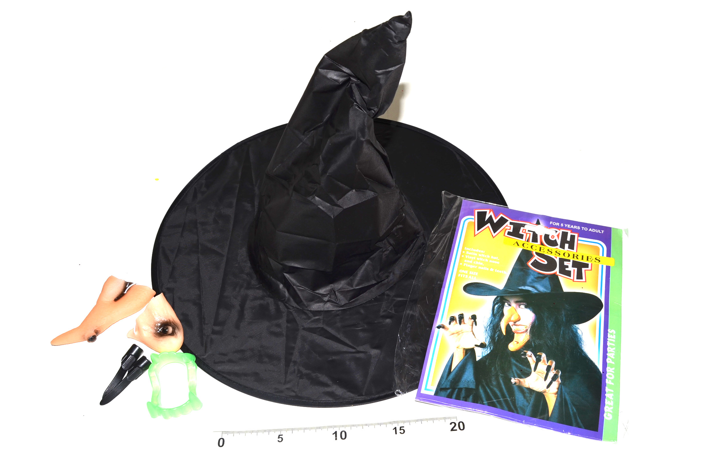 Set pro každou správnou čarodějniciSet obsahuje: bradu na gumičce, nos na gumičce, 10 nasazovacích prstů s nehty, zuby a velký čarodějnický klobouk
