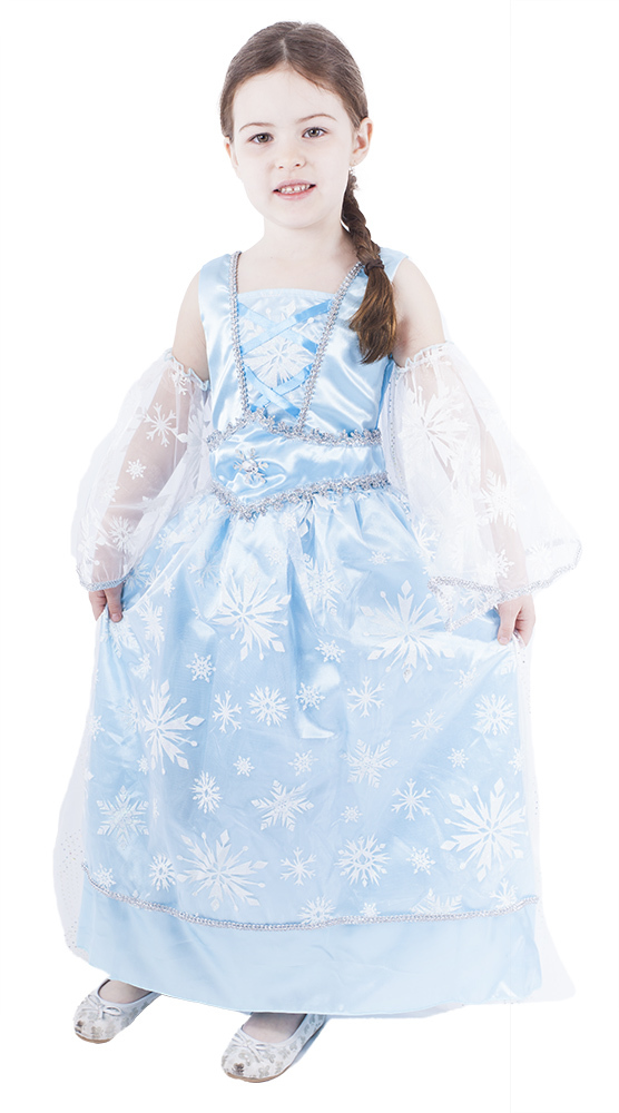 Překrásný karnevalový kostým pro malé sněhové princezny. Šaty ve velikosti M jsou určeny pro holčičky ve věkovém rozmezí 6-8 let (116-128 cm). Mají ledově modrou barvu se stříbrným lemováním, třpytivé rukávy a celé jsou dekorovány úchvatnými sněhovými vločkami. Součástí je také třpytivý závoj. číst celé