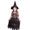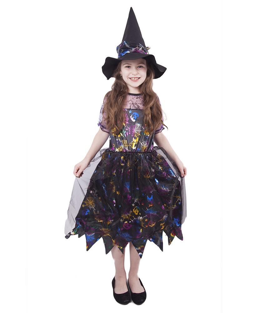 Karnevalový kostým pro malé čarodějnice! Kostým černo-fialové barvy ve velikosti M je určen pro holčičky ve věkovém rozmezí 6-8 let. Šaty jsou dekorovány barevnými halloweenskými motivy. Součástí kostýmu je perfektně sladěný čarodějnický klobouk. S tímto úchvatným kostýmem se zaručeně staneš hvězdou karnevalu i Halloweenu!