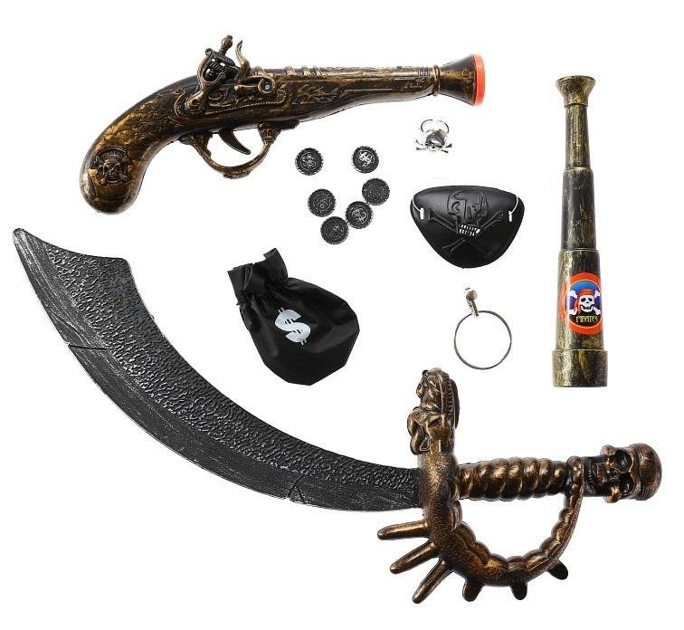 ZESTAW DZIELNY PIRAT (Z LUNETĄ) W skład zestawu wchodzą: szabla, pistolet, luneta, opaska na oczy, srebrny pierścionek z czaszką, duży okrągły kolczyk, worek monet Długość szabli: 47 cm Długość pistoletu: 29 cm Długość lunety: 10 cm Materiał: plastik číst celé