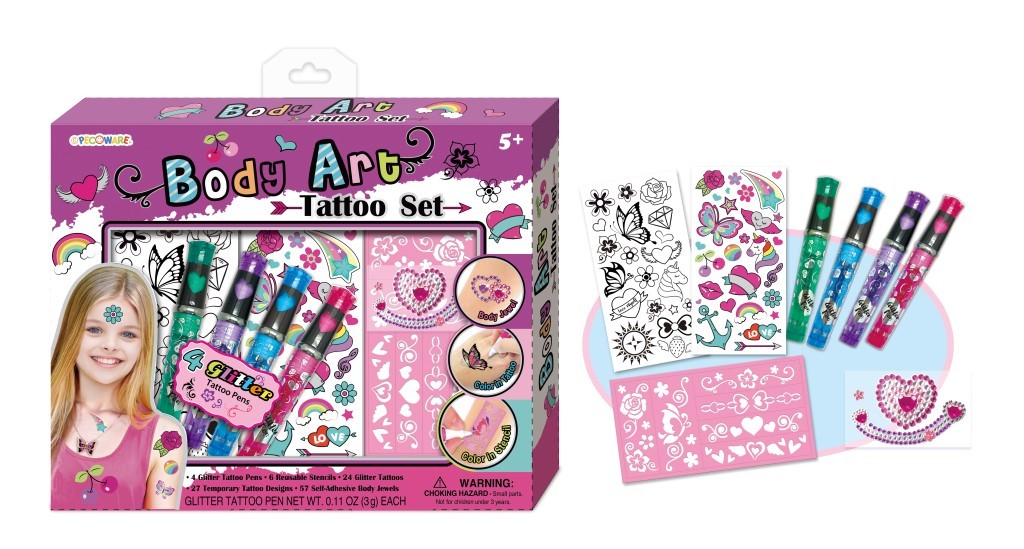 - Sada obsahuje: barevná tetovací pera, šablony na vzory, třpytivá tetování a kamínky.