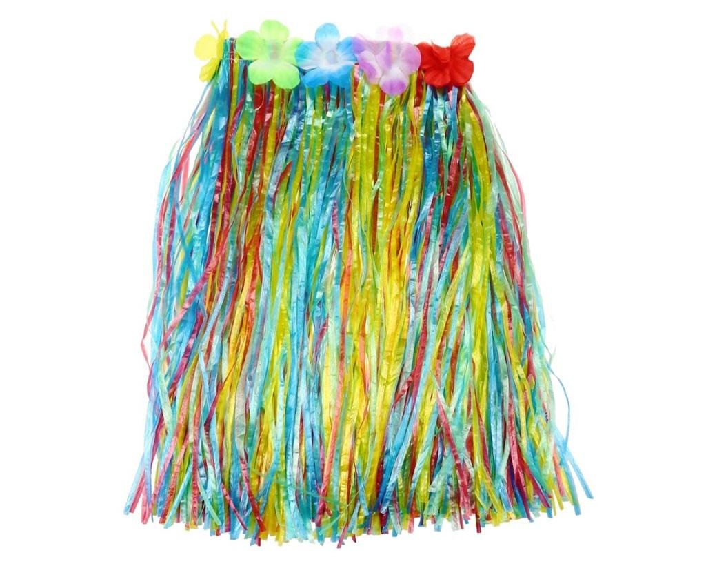 SPÓDNICA HAWAJSKA WIELOKOLOROWA Rozmiar: uniwersalny Długość: 40 cm Szerokość w pasie: 24 cm Kolor: wielokolorowy Materiał: folia Spódnica w pasie ozdobiona jest licznymi kolorowymi kwiatkami. Zapinana na rzep, dopasowuje się do każdej postury ciała.