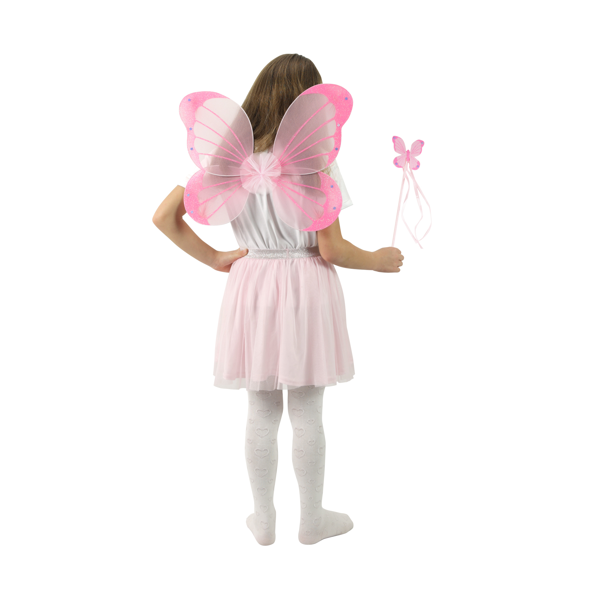 Set obsahuje krásná růžová motýlí křidélka, která jsou pohodlně upevněná na gumičku, takže se snadno a bezpečně přizpůsobí dětem ve věku od 3 do 10 let, respektive výšce 104 až 150 cm. Součástí balení je také hůlka, která doplní celý kostým a podpoří fantazii každé malé dívky při hraní i slavnostních příležitostech.