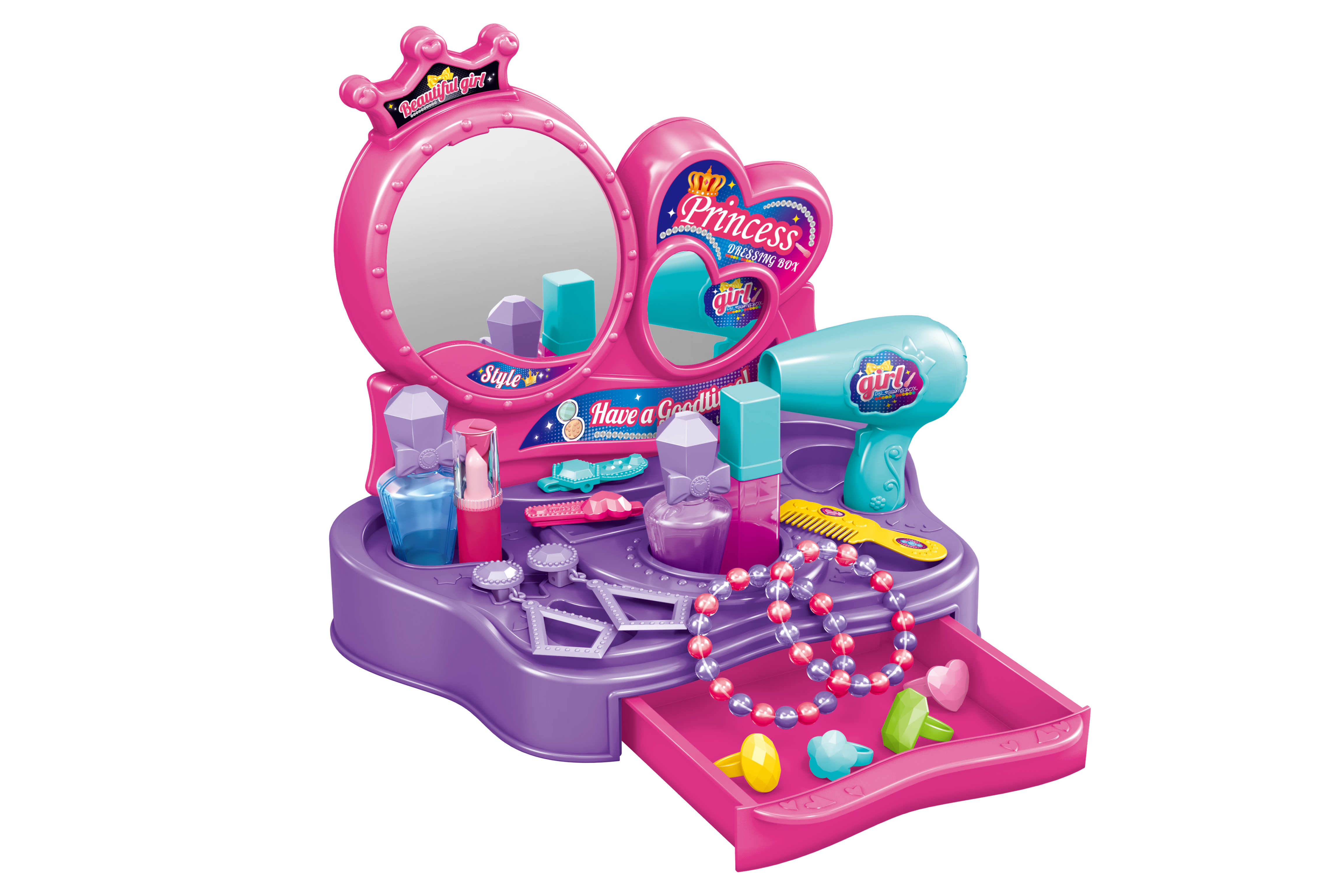 Kosmetický stolek s doplňky set. Rozměry 25x23x22 cm. Balení obsahuje: stolek se zrcátkem, fén, prsteny, náramky, sponky do vlasů, lahvičku od parfému, rtěnku.