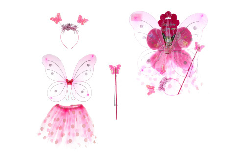 - Sada obsahuje: křídla, sukýnku s puntíky, hůlku a čelenku s motýlky