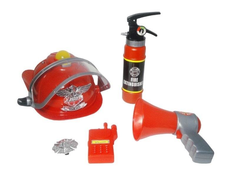 Zestaw strażacki dla chłopca marzącym o pracy strażaka. Z takim zestawem można przystąpić do zabawy. Zabawka zawiera m.in.: kask, który świeci; gaśnicę, krótkofalówkę, odznakę, megafon. Produkt działa na baterie typu AG13. Baterie znajdują się w zabawce. Całość zapakowana jest w worek z siateczki. Podane wymiary są wymiarami kasku. Produkt dla dzieci od 3 lat.