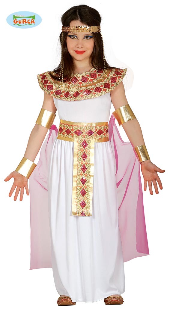 Tento kostým pro děti ve věku 7-9 let obsahuje elegantní šaty s dekorativním závojem, límcem a návleky na ruce. Vše bylo navrženo tak, aby dítěti umožnilo pohodlný pohyb a zároveň zaručilo autentický vzhled inspirovaný fascinující historií starověkého Egypta. Čelenka není součástí balení, což umožňuje doplnit kostým o vlastní kreativní doplňky a upravit ho podle představ.